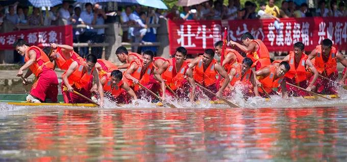 赛龙舟是中华民族的传统运动项目,广西各地每年都组织大大小小的龙舟赛,各地纷纷组建自己的龙舟队伍,比赛日观众云集、热闹非凡。