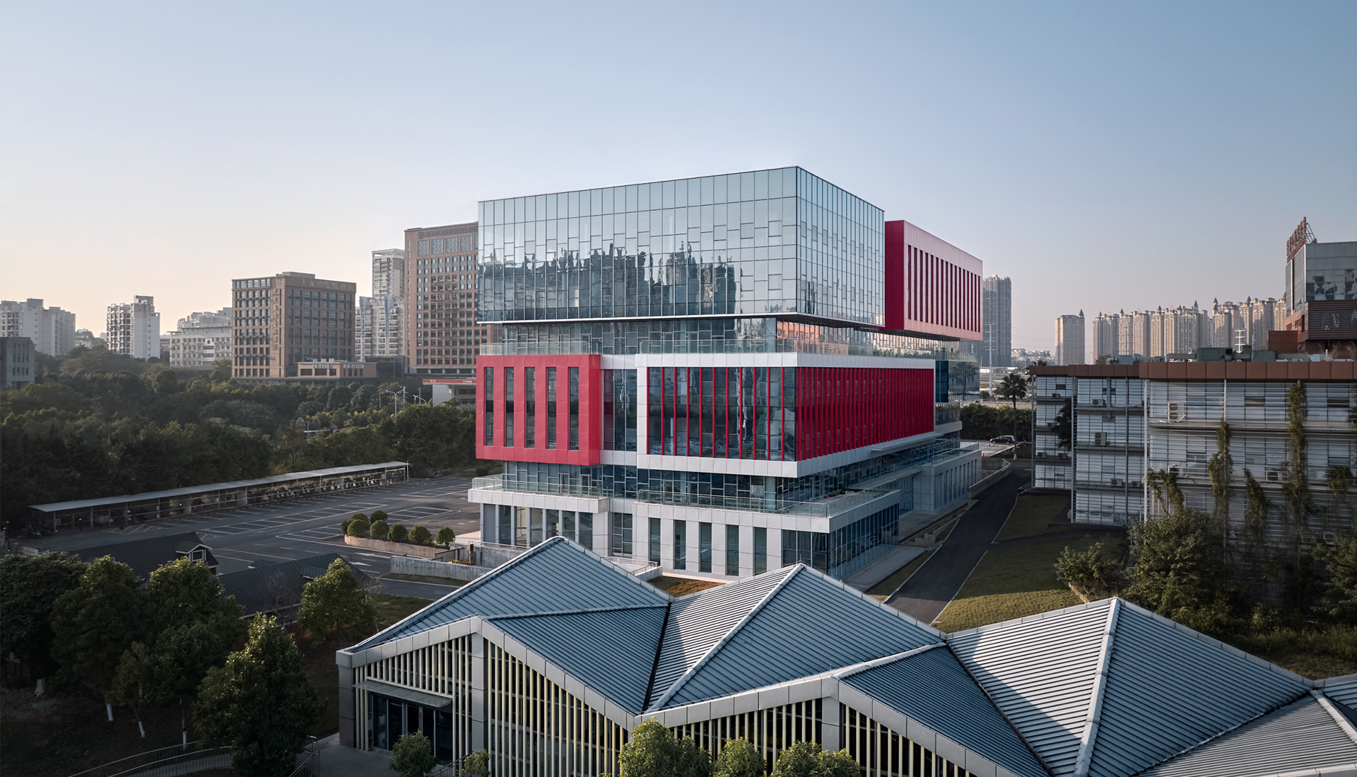 元素创新:提取场地内现有建筑的设计元素:红色、数、连廊、百叶。红色强化体量,加强新老建筑间的视觉维系模数反映老实验大楼的模块化特征,适应现代实验室的标准化灵活性要求;连廊加强新老建筑之间的空间联系和流动性;百叶用以适应南宁气候的隔热要求和创造富于韵律的立面效果。