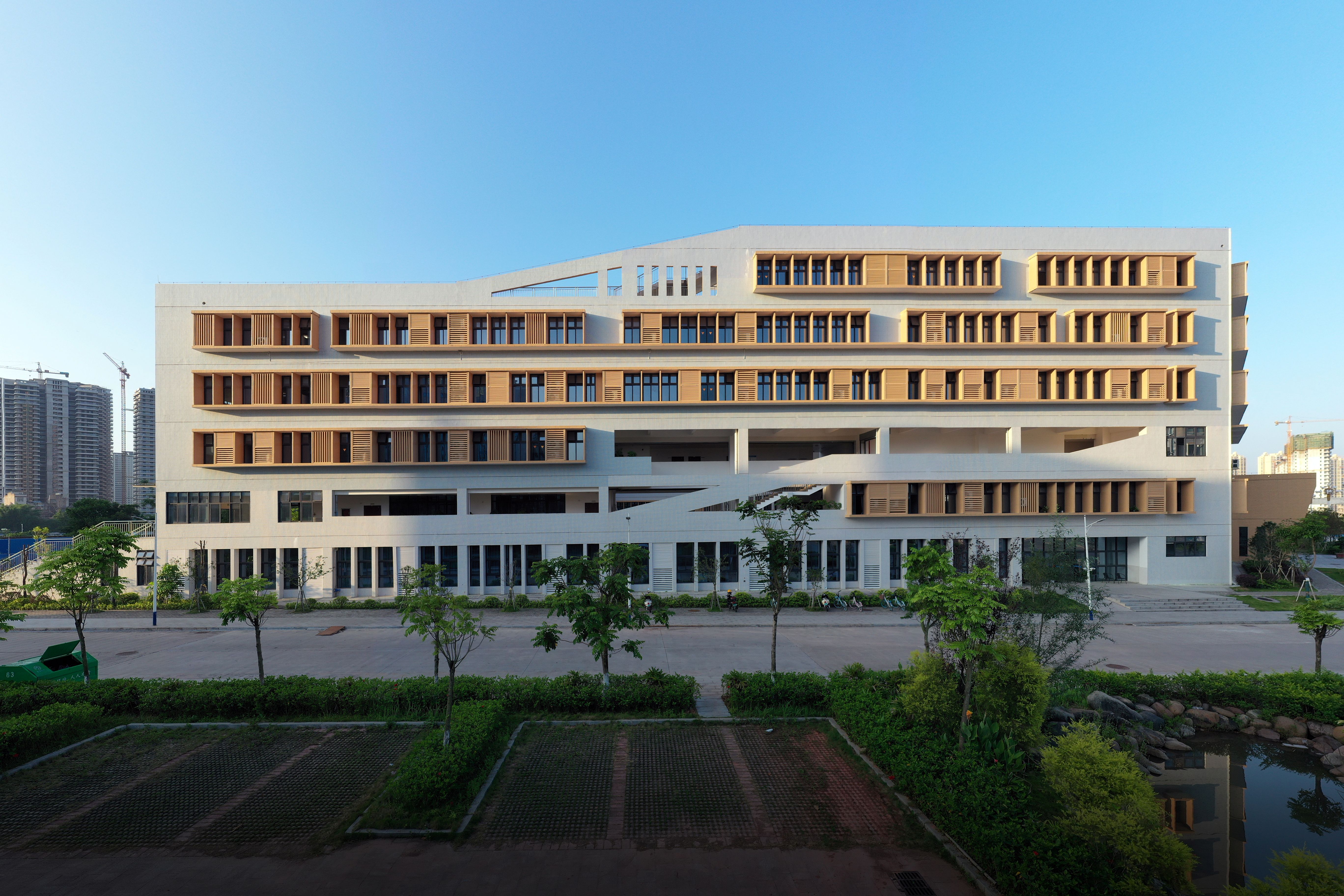 3、多维空间,立体校园:以连贯的垂直流线为设计理念,首层架空、庭院等多重地面系统打造出丰富多样的垂直立体空间。通过楼梯和平台串联起多层次的开放空间,构筑高效便捷的垂直交通网络,打造立体式多维度的空间体验。