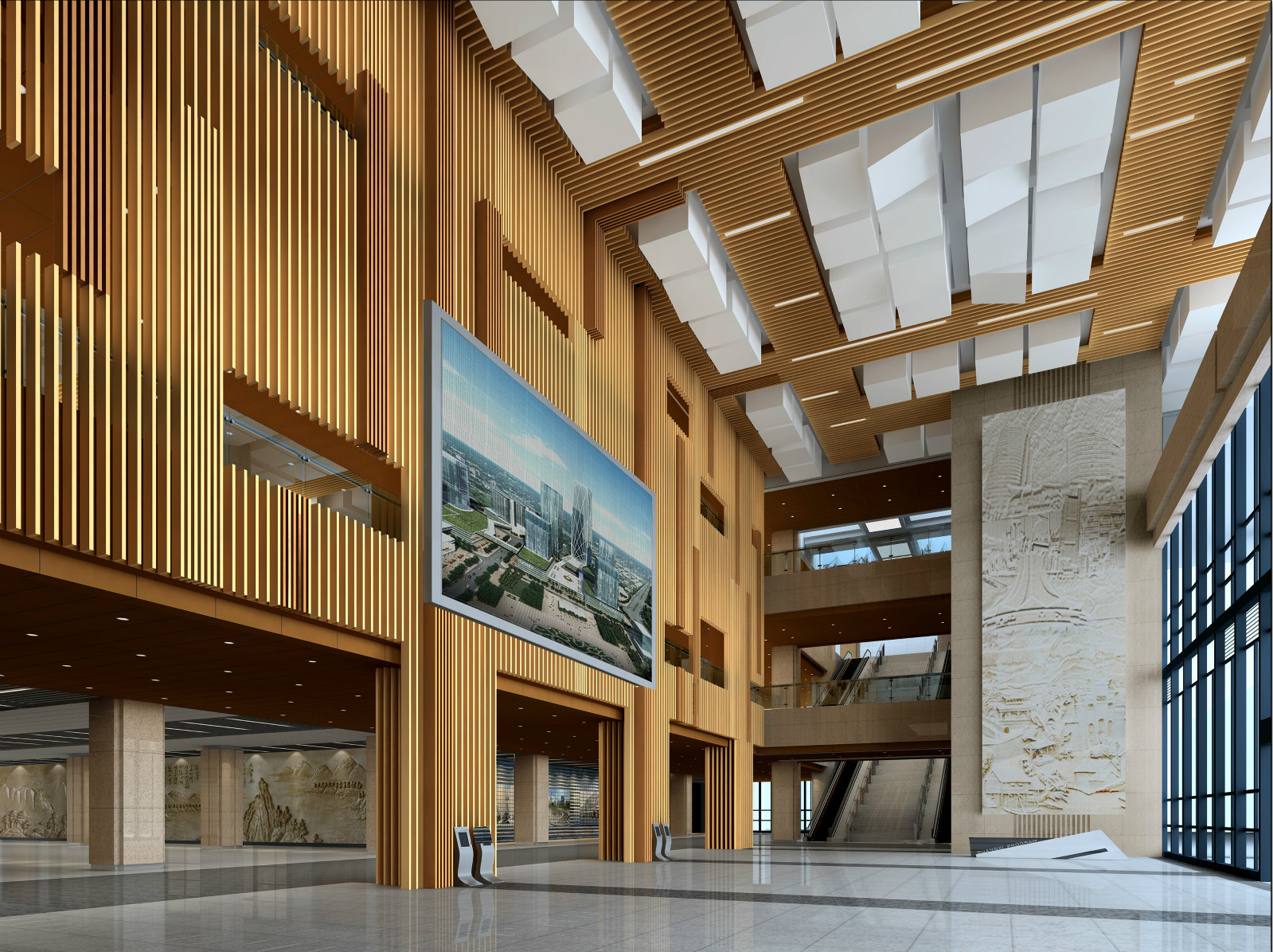 广西城市规划建设展示馆位于五象新区区重大公益性项目片区,该项目2010年3月份设计,2011年12月交付业主使用。 广西城市规划建设展示馆进行室内公共空间组成了展馆建筑内部的开放空间体系,它不但要满足规划馆里面的服务、交通组织、休息等候等基本功能,还是规划馆空间视觉景观轴线上的重要节点,成为室内各个空间、室内空间与外部环境相联系的媒介,同时,为了营造展馆特有的氛围,大堂空间设计还应反映出广西独特的地域性和文化性,从而使参观者在有序的环境和浓郁的文化氛围中得到身心的体验。