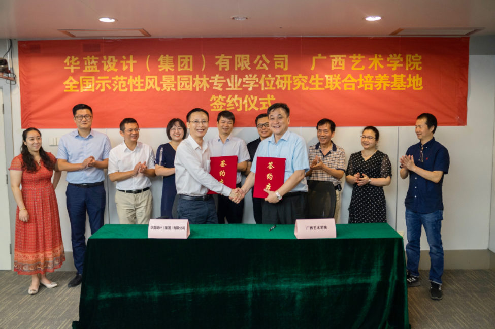 5月28日上午,华蓝设计(集团)有限公司与广西艺术学院共同举行“全国示范性风景园林专业学位研究生联合培养基地”签约暨揭牌仪式。华蓝设计(集团)有限公司总经理莫海量、广西艺术学院副校长侯道辉签订了《共建全国示范性风景园林专业学位研究生联合培养基地协议》 。