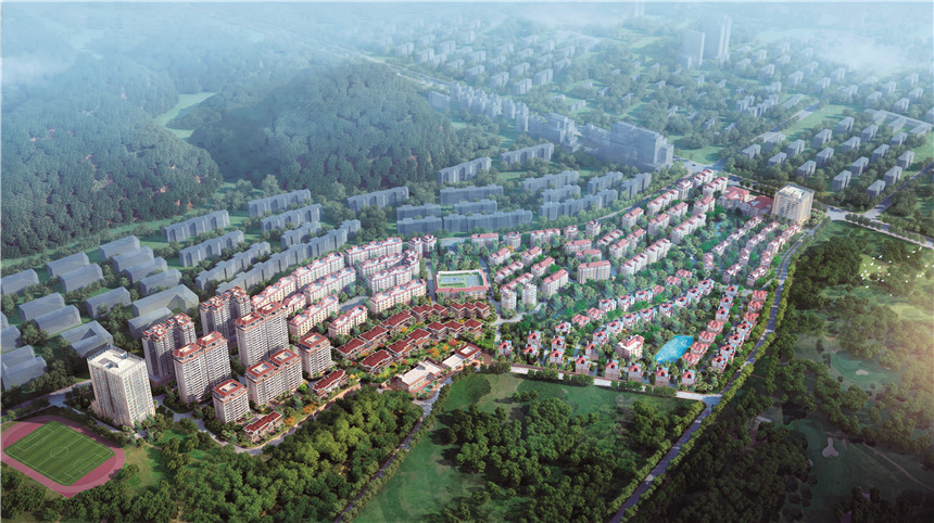 总平规划中利用地形的高差,因地制宜,住宅自南到北高度逐渐升高,扩大景观视野。建筑风格结合本地生活特色及精致文化品位,广泛运用天然原材料,体现稳重端庄的气质及豪华感。多层联排住宅面向青山设置大面积观景阳台,将青山美景“借”入宅中。高层住宅、公寓及配套公建以现代材料与古典元素相结合,加入适应本地气候的大挑檐屋顶。简洁稳重的型体,错落有致的阳台,繁花似锦的后花园,避免过多的人工色彩,仿佛盛放于自然的居所。