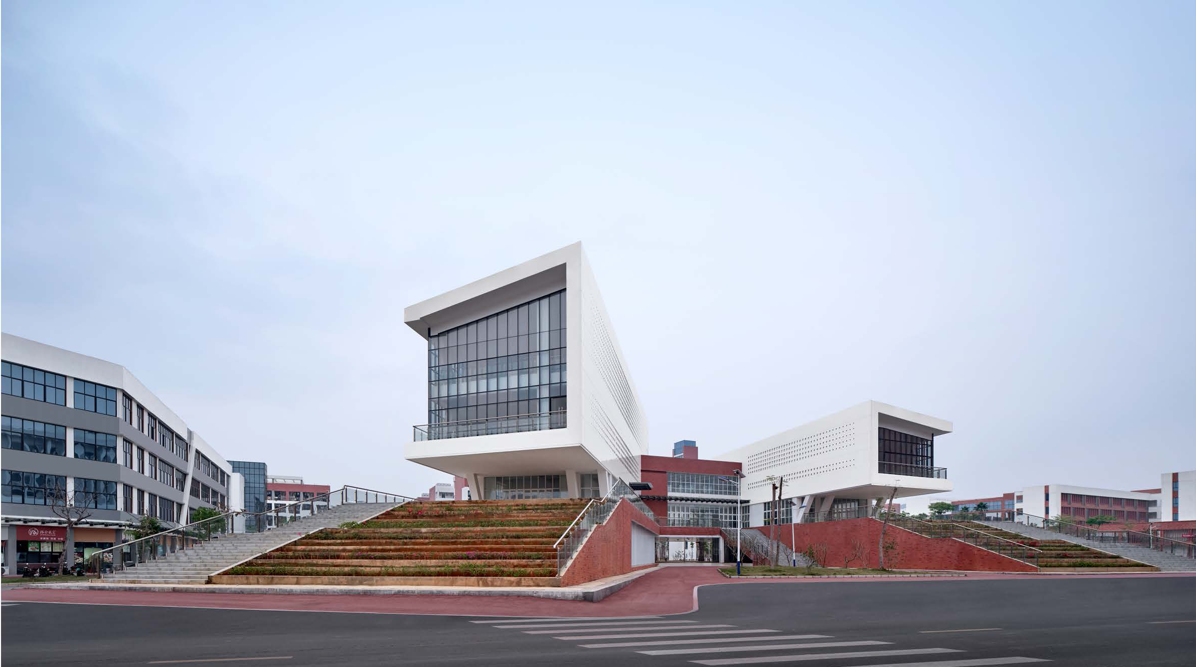 校园规划采用“三轴三心多点”的形式来组织空间布局;校区的建筑单体设计追求功能灵活合理、设施完善进行合理的构想与设计;建筑造型上,采用现代风格平顶建筑形式,立面采用白色调为主,砖红色及暖木色为辅的色彩设计,与当地地域特征及气候相结合,错落的体型,丰富的虚实对比,明快柔和的色彩月园林生态绿化相映生辉,体现高雅休闲的建筑品味。打造优美的基地环境,合理、高效的解决基地多元化的功能需求,构筑一个高水准的校园建筑环境。